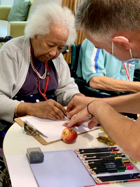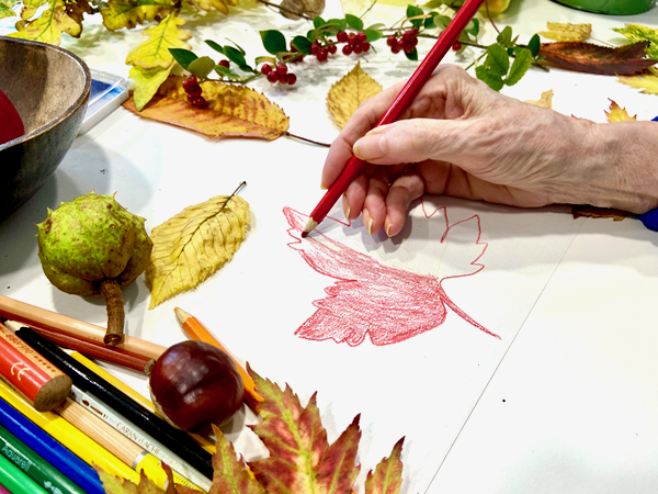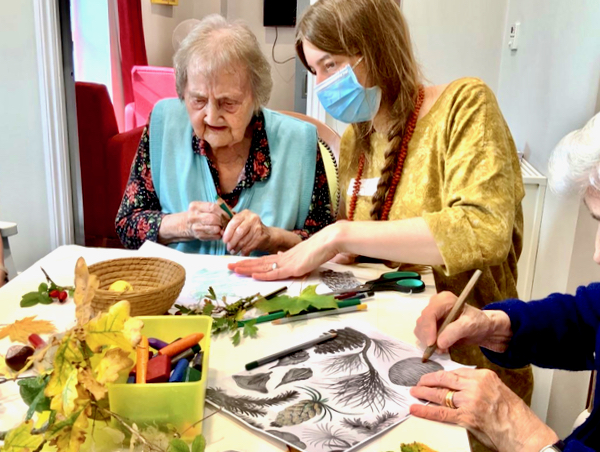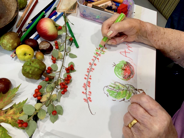 Going into people’s homes, whether a house where they have lived for decades, or some kind of residential care home/supported living, I meet the person as they are now, but also aim to provide opportunities for them to remember and share something of themselves from the past. Holding a freshly emerged conker, one woman laughingly shared with Rachel her memories of an Autumn walk with a friend, and almost being hit on the head by one. Another wrote a poem, after drawing some leaves from her garden, a poem that she had read years before and didn’t realise she still knew.